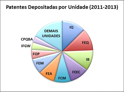 Conforme dados oficiais da INOVA-UNICAMP a FEEC depositou, 7, 9 e 11 patentes, nos anos de 2011, 2012 e 2013 de um total de 80, 89 e 92, respectivamente. Conforme gráfico abaixo, que mostra a atuação de cada uma das unidades da universidade em números de patentes, é possível verificar que a FEEC é a quarta unidade em número de pedidos no período, com 27 do total de 262 patentes depositadas.
